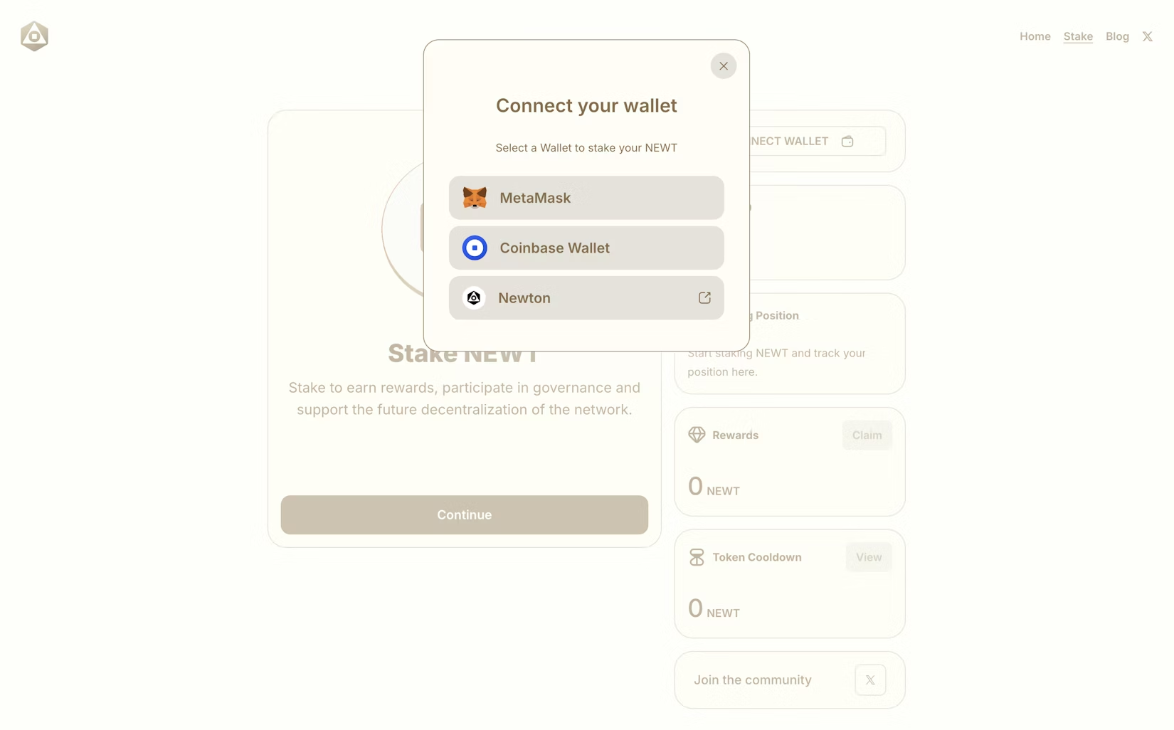 - Go to Staking.newt.foundation and connect your MetaMask or Coinbase Wallet