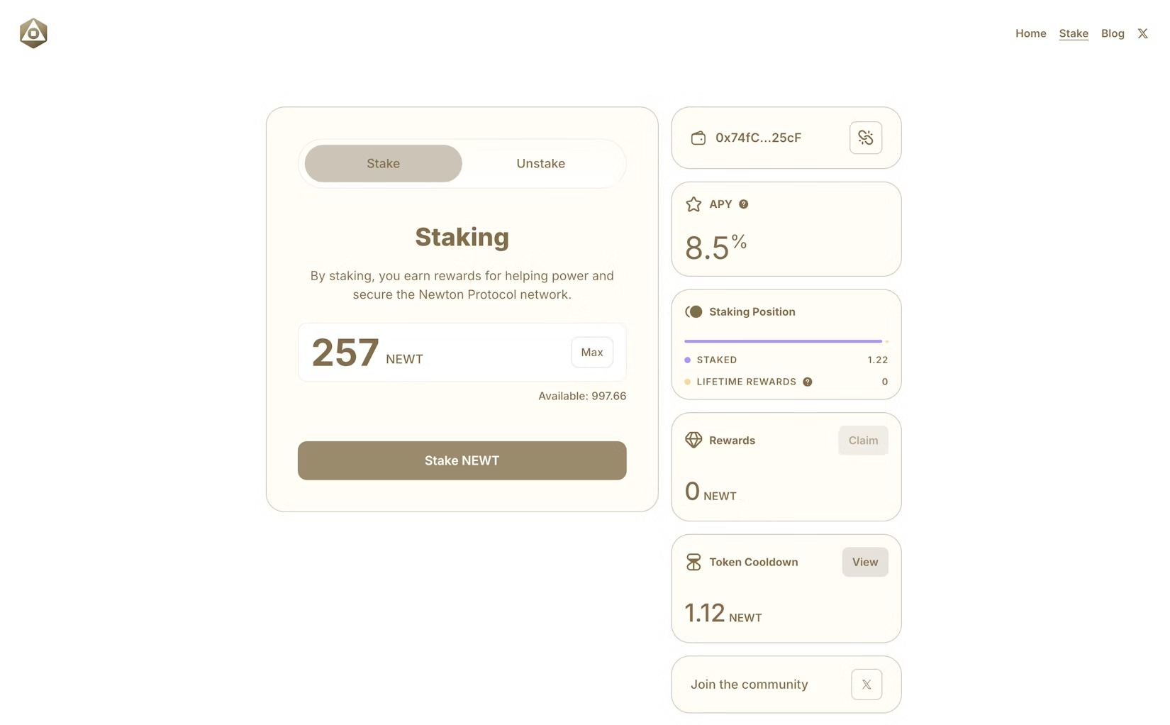 Yes, partial unstaking is supported. However, if you withdraw unstaked NEWT after the cooldown period has ended, you will only be able to withdraw the full amount that was unstaked. - How do I unstake my NEWT?