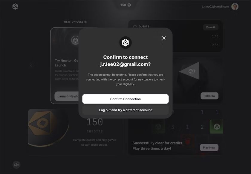- Link your Newton Portal account to tie eligible airdrop allocations from Newton Portal, Guild.xyz and Discord activity to your Newton.xyz account. If you’ve completed the Newton.xyz quest within Newton Portal, your Portal account has already been linked to your Newton.xyz account and you can skip this step