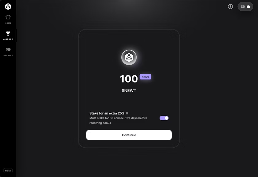 - Stake NEWT immediately upon airdrop claiming to receive a 25% bonus