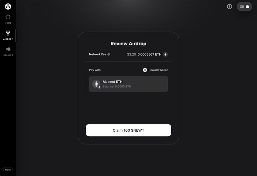 To minimize cost while still allowing users the flexibility to explore all of Newton Protocol’s automation agents in the present and future, users will claim through their Newton Reward Wallet (EOA). Smart contract wallets on Ethereum mainnet are expensive and claiming the airdrop would require a wallet activation fee that we felt would be cost prohibitive for the community.