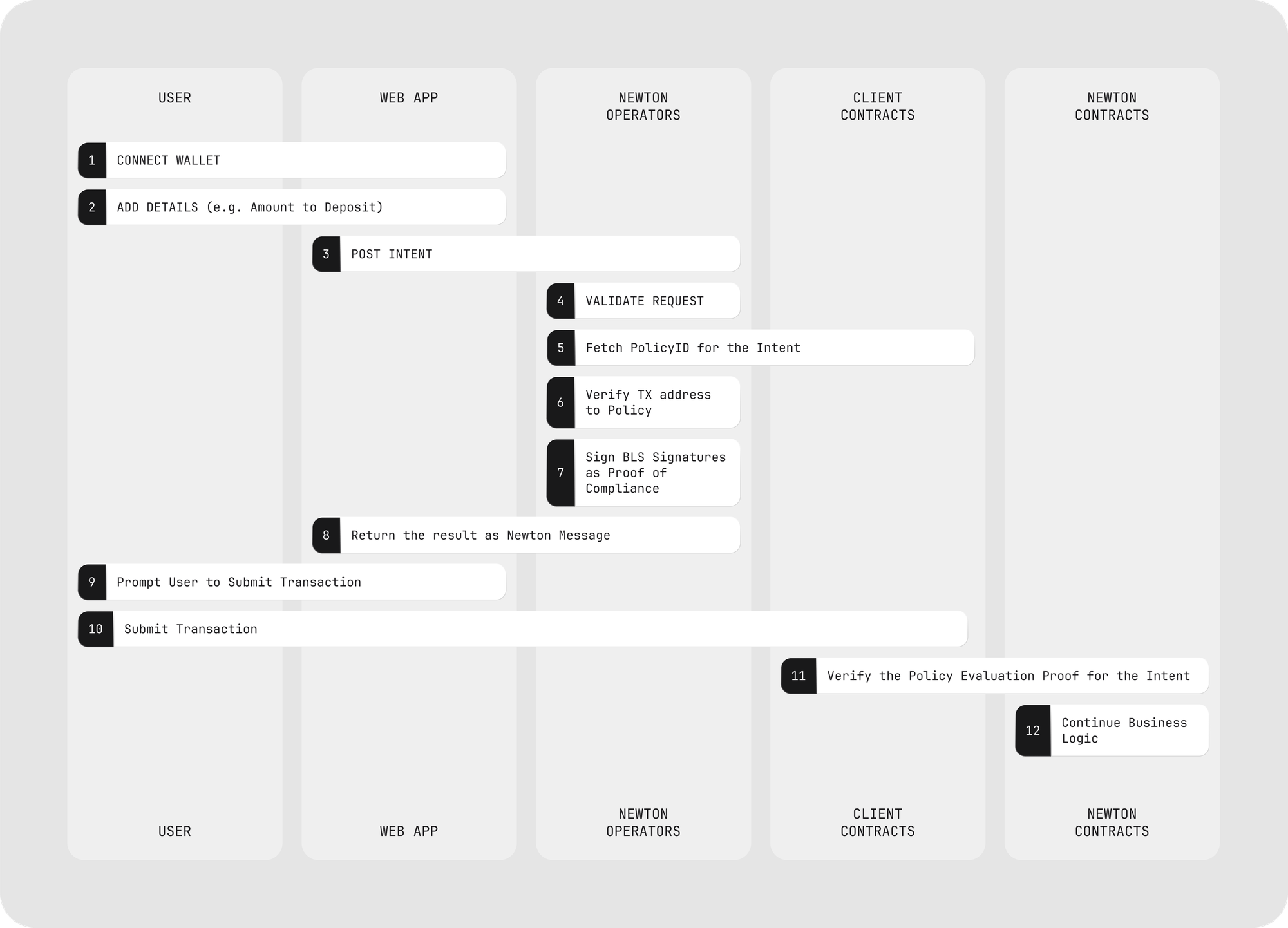 - App nests the authorization proof into the call and submits its corresponding Newton Policy Client contract to execute the authorized intent.