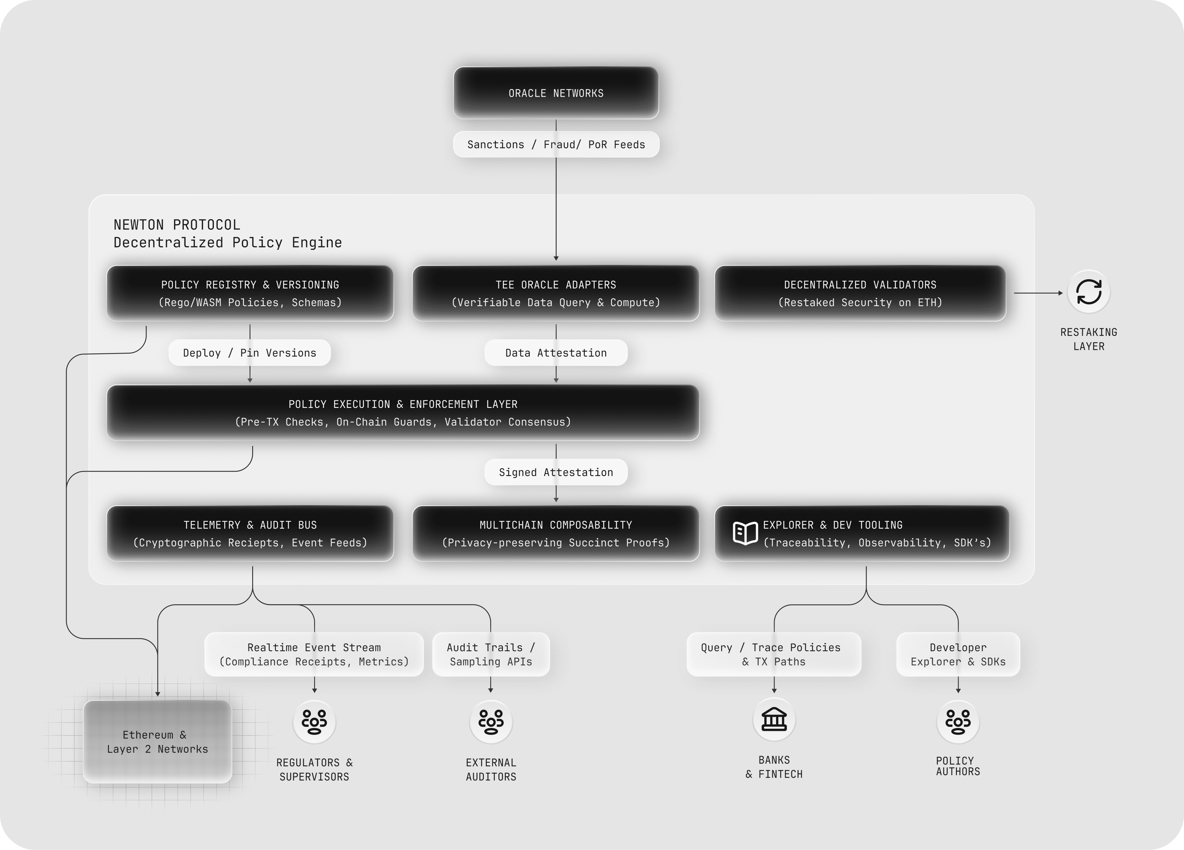 Newton Protocol is designed as this substrate. At its core, Newton Protocol is a decentralized policy engine that enables the encoding and enforcement of compliance rules, risk controls and business logic as machine-executable policies.